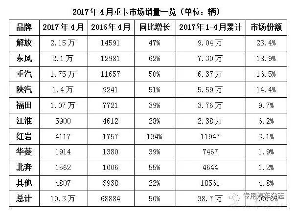 點(diǎn)擊量:15694月重卡同比增5成 5月會(huì)是拐點(diǎn)嗎?還記得在2016年底,不少業(yè)內(nèi)人士分析2017年重卡銷量走勢(shì)時(shí)指出,2017年重卡的火爆形勢(shì)會(huì)終結(jié)在一季度,從4月份開始下滑。事實(shí)情況如何呢?據(jù)相關(guān)機(jī)構(gòu)統(tǒng)計(jì)的數(shù)據(jù),今年4月,國(guó)內(nèi)重卡市場(chǎng)銷售各類車輛共計(jì)約10.3萬(wàn)輛,比去年同期的6.89萬(wàn)輛大幅增長(zhǎng)50%,環(huán)比下降10%。4月銷量同比增長(zhǎng)50% 解...